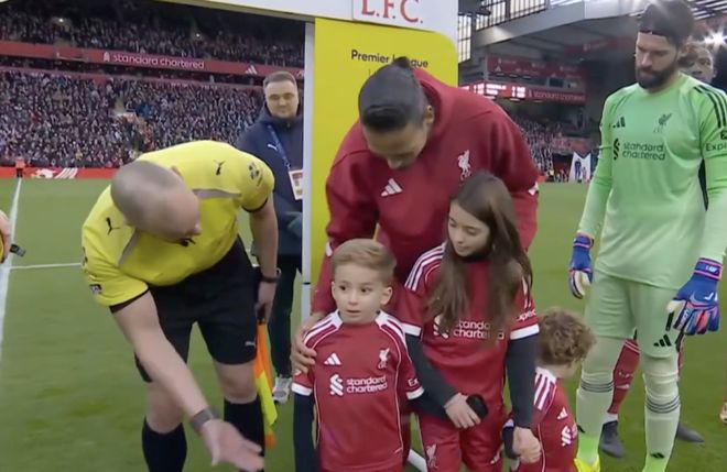 他们的出现让比赛显得温情脉脉,范戴克躬身向孩子们示意,与裁判组击掌,而三名裁判也俯身与两名孩子击掌。